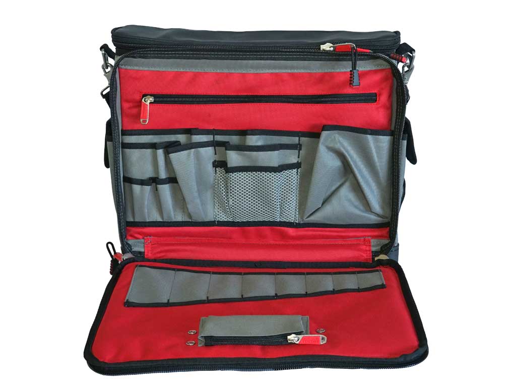 Stellen Sie sich Ihr eigenes Werkzeugset zusammen und verstauen die Werkzeuge sicher in dieser Werkzeugtasche!Diese vielseitig einsetzbare und robuste Werkzeugtasche mit 21 Fächern eignet sich zur sichern Unterbringung und zum Transport verschiedenster Werkzeuge und Verbrauchsmaterialien.